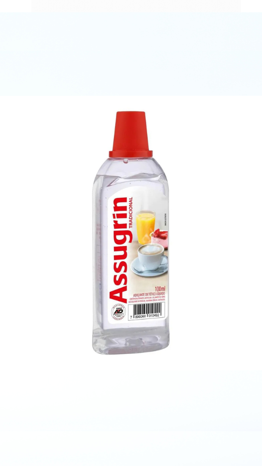 Adoçante líquido Assugrin 100ml, com ciclamato e sacarina. Ideal para quem busca reduzir o consumo de açúcar com sabor agradável e sem calorias.