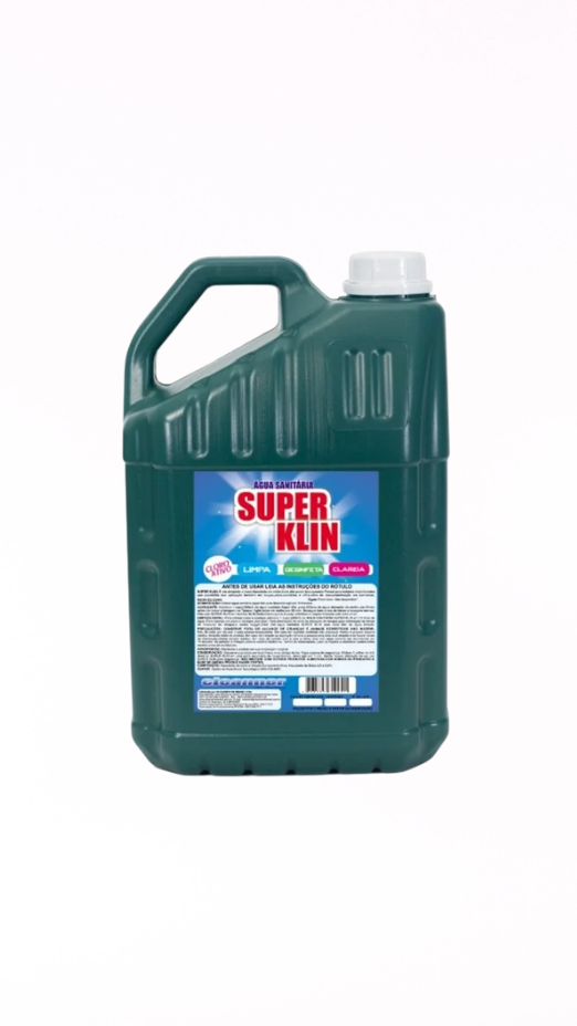 Água sanitária Super Klin 5 litros. Ideal para limpeza pesada, desinfecção eficaz e alvejamento de roupas com alta performance e excelente rendimento.