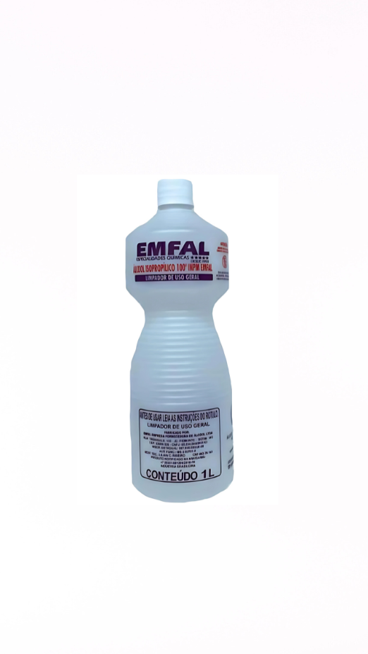 Álcool isopropílico de alta pureza (100º INPM), frasco com 1 litro. Indicado para limpeza técnica e desinfecção de superfícies delicadas e componentes eletrônicos.