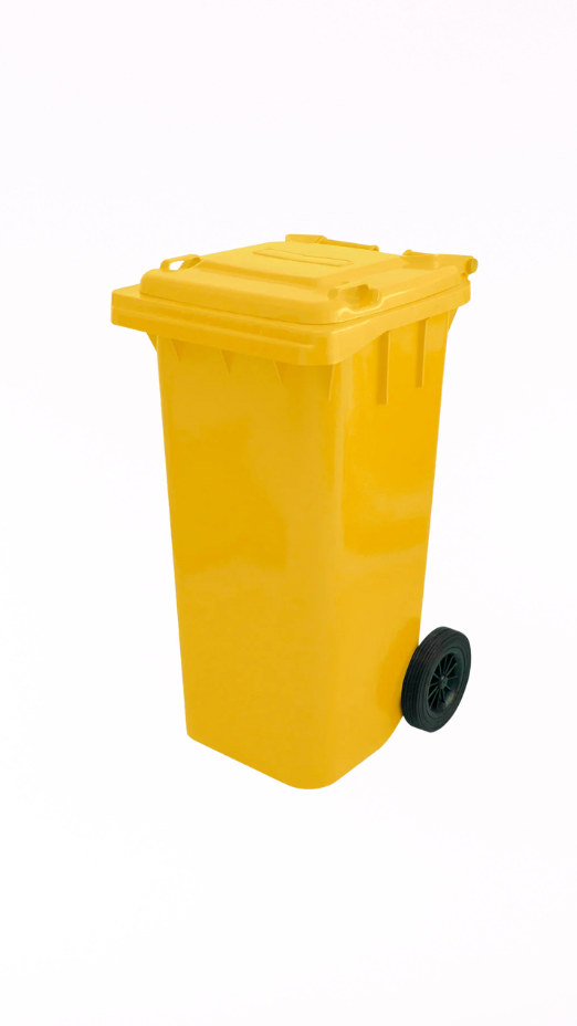 Contêiner de 120 litros com rodas na cor amarela, ideal para coleta e transporte de resíduos recicláveis com praticidade e segurança.
