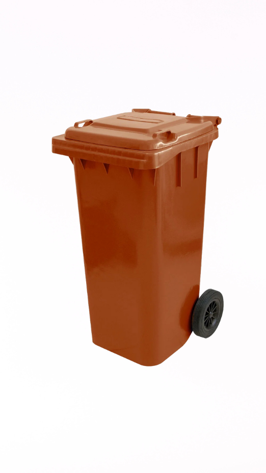 Contêiner de 120 litros com rodas na cor marrom, ideal para coleta seletiva de resíduos orgânicos com alta resistência e mobilidade.