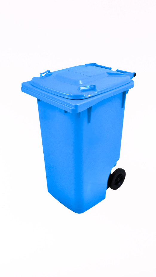 Contêiner de 240 litros com rodas, na cor azul, ideal para coleta seletiva e transporte de resíduos recicláveis em ambientes diversos.