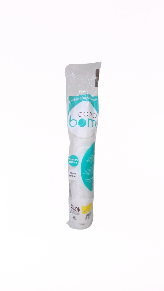 Copo descartável de 200ml, fabricado em poliestireno (PS), da marca Copobom, ideal para servir bebidas em eventos, festas e para uso diário. Embalagem com 200 unidades.