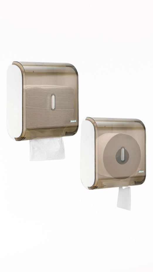 Dispenser para papel toalha em rolo (rolão), com design moderno em acabamento fumê translúcido. Ideal para ambientes corporativos e de grande circulação.
