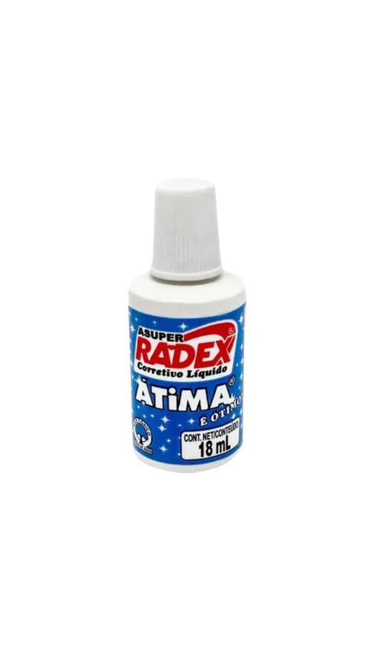 Corretivo líquido Radex Atima, 18ml. Corrige erros de escrita com precisão e secagem rápida, garantindo praticidade e acabamento limpo em documentos e trabalhos escolares.