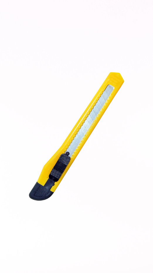 Estilete com lâmina estreita, ideal para cortes precisos em papel, plástico, cartolina e outros materiais leves, com segurança e praticidade.