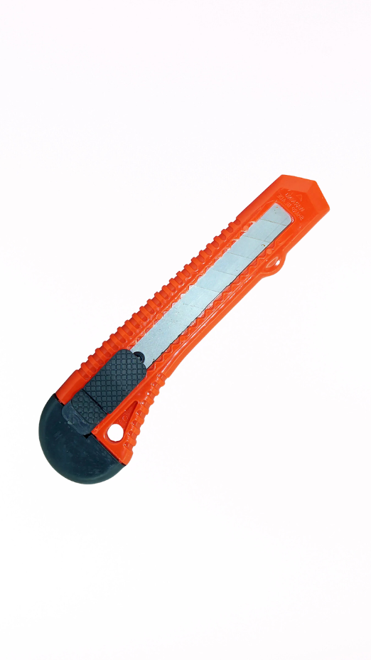 Estilete com lâmina larga, ideal para cortes robustos em papelão, borracha, plásticos e materiais mais resistentes, com segurança e durabilidade.