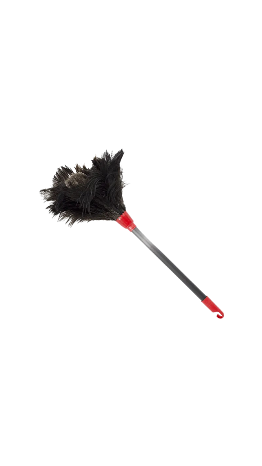 Espanador com penas naturais de avestruz, ideal para remoção eficiente de pó em superfícies delicadas, com cabo anatômico e alcance prático de 32 cm.