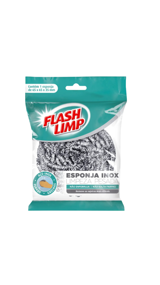 Esponja de aço para limpeza pesada da FlashLimp, ideal para remoção de sujeiras difíceis em panelas, grelhas, assadeiras e superfícies metálicas. Alta durabilidade e ação desengordurante.