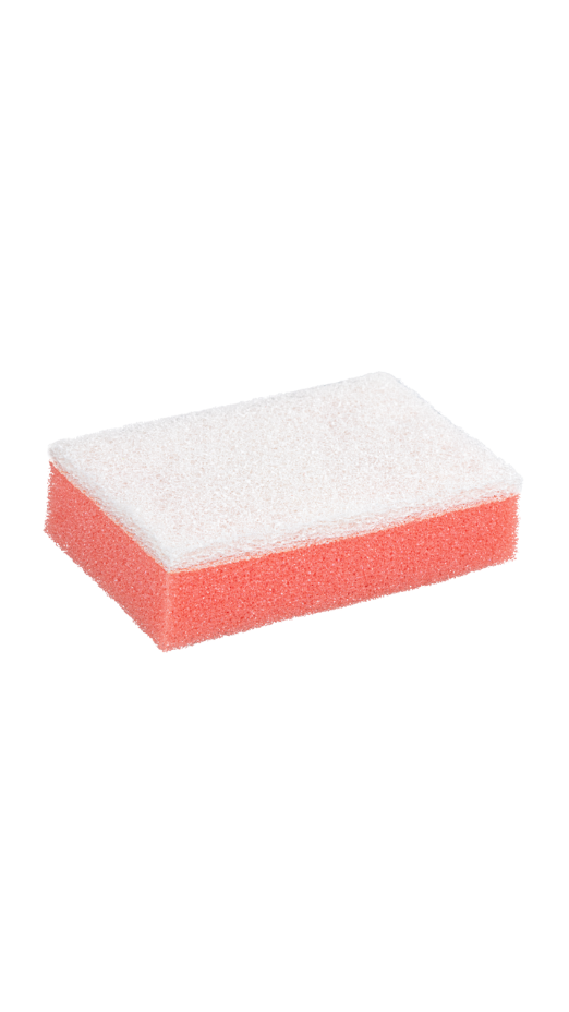 Esponja dupla face com dimensões de 110×75 mm, ideal para limpeza eficaz e delicada. Face abrasiva branca que não risca e espuma rosa macia para superfícies sensíveis.