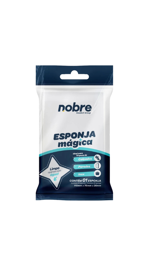 Esponja mágica da marca Nobre, modelo 58641, ideal para remoção de manchas difíceis em diversas superfícies sem a necessidade de produtos químicos. Limpa apenas com água.