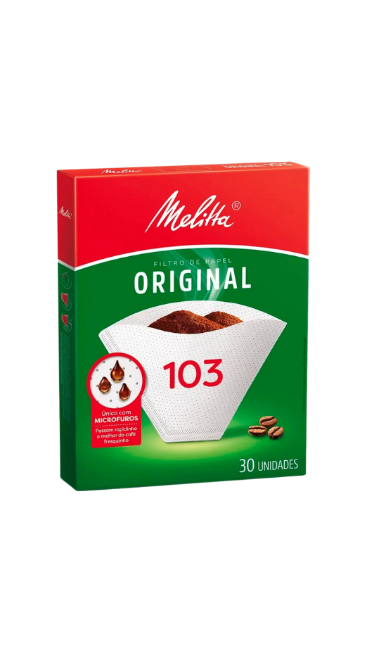 Filtro de papel Melitta tamanho 103, ideal para o preparo de café coado com maior rendimento e pureza. Embalagem prática com 30 unidades descartáveis.