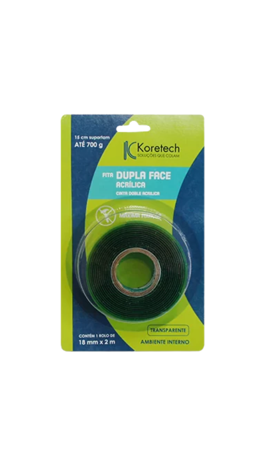 A Fita Dupla Face Fixa Forte 18mm x 20m da Koretech é projetada para proporcionar uma fixação forte e resistente em materiais como vidro, metal, plástico, madeira e superfícies pintadas. Seu adesivo acrílico de alta performance garante uma colagem durável, ideal para uso interno em escritórios, indústrias, oficinas e aplicações domésticas. O acabamento é limpo e discreto, dispensando o uso de parafusos ou cola líquida.