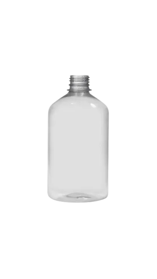 Frasco plástico transparente com capacidade de 500 ml, tampa com rosca 28/410, ideal para armazenamento seguro e transporte de líquidos diversos.