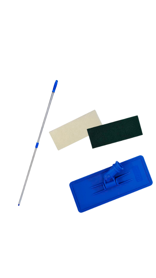 Kit de limpeza completo com cabo, suporte para fibraço e duas fibras (azul e branca), ideal para remoção eficiente de sujeiras em diversas superfícies, garantindo praticidade e durabilidade.