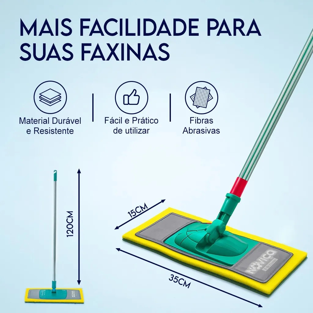 Kit de limpeza com mop abrasivo e cabo incluso, ideal para remoção de sujeiras pesadas em pisos, azulejos e superfícies laváveis.