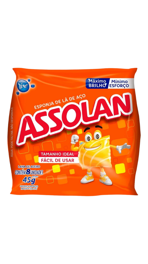 Lã de aço Assolan com 8 unidades de 45g cada, ideal para limpeza pesada, polimento e remoção de sujeiras difíceis.