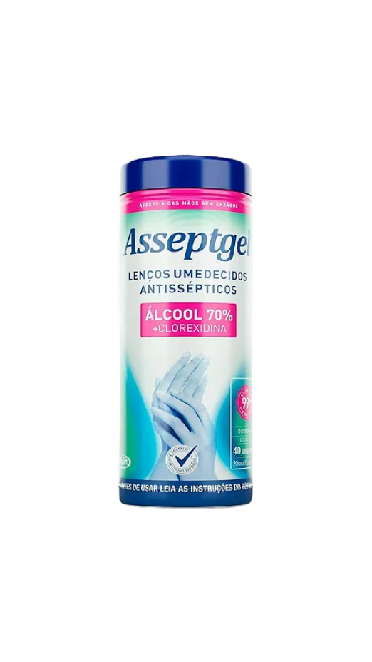 Os Lenços Umedecidos Álcool 70% + Clorexidina da Asseptgel vêm em pote com 40 unidades e são ideais para higienização rápida e segura da pele, eliminando bactérias e outros microrganismos. A combinação de álcool 70% com clorexidina potencializa a ação antisséptica, garantindo limpeza profunda e proteção contra infecções. Práticos para uso doméstico, profissional ou em ambientes de saúde, proporcionam sensação de frescor e cuidado.