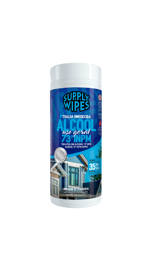 Lenços umedecidos com álcool 73º, em pote com 35 unidades, ideais para higienização prática e rápida em uso geral.