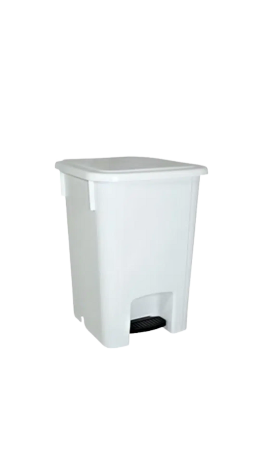 Lixeira branca de 15 litros com pedal, reforçada e durável, ideal para ambientes que exigem higiene e resistência.
