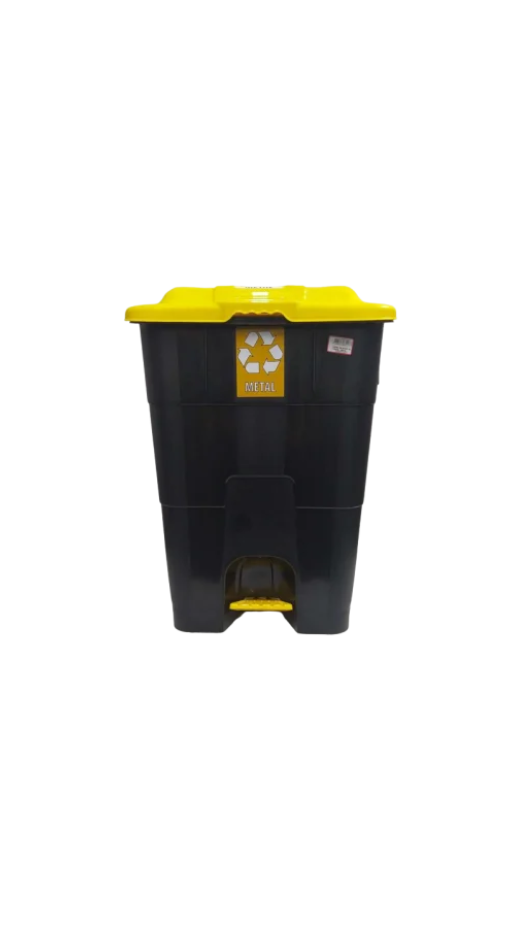 Lixeira de 60 litros com pedal na cor amarela. Robusta e prática, ideal para descarte seguro de resíduos, conforme normas de coleta seletiva.