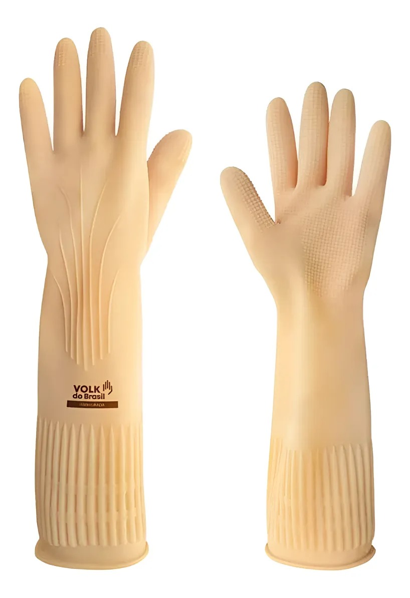 Luva de Látex Longa Ranhurada 40 CM Volk CA 15100proteção do antebraço, excelente resistência e durabilidade. Luva de segurança confeccionada em látex de borracha natural, acabamento interno liso (clorinado), antiderrapante na face palmar e dedos.