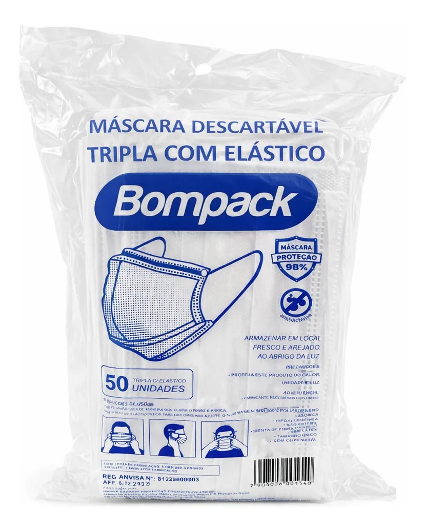 Máscara Descartável Tripla com Elástico Bompack – 50 Unidades Proteja-se com conforto e praticidade no dia a dia! A Máscara Descartável Tripla com Elástico Bompack foi desenvolvida para oferecer segurança e higiene em ambientes que exigem maior cuidado com a saúde. * Proteção tripla camada: barreira eficiente contra poeira, gotículas e agentes externos. * Confortável: elástico macio e ajuste anatômico que não machuca as orelhas. * Uso diário: ideal para consultórios, farmácias, clínicas, comércio, transporte público e uso pessoal. * Praticidade: embalagem com 50 unidades, garantindo mais economia e segurança para toda a família ou ambiente de trabalho. Tamanho Ùnico Uso único e descartável