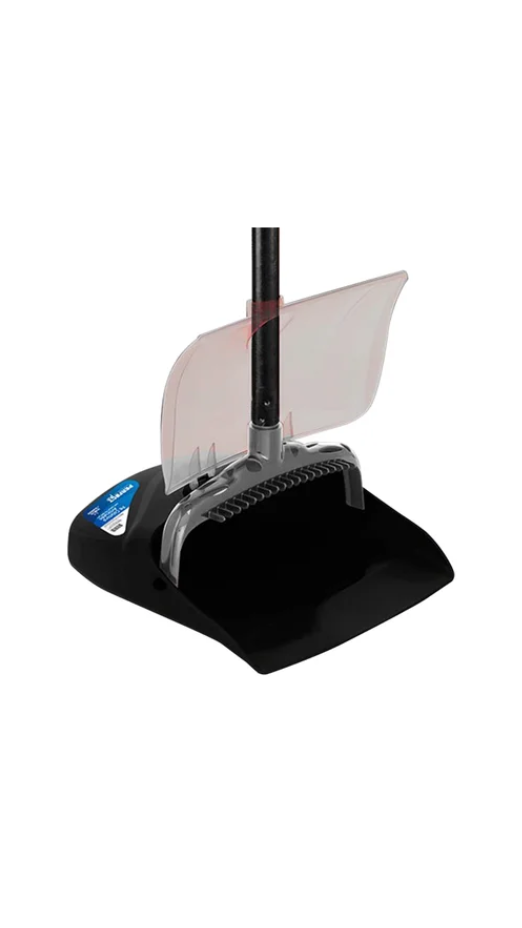 Pá coletora com cabo longo, ideal para facilitar a coleta de resíduos sem a necessidade de abaixar, proporcionando mais conforto e eficiência na limpeza.