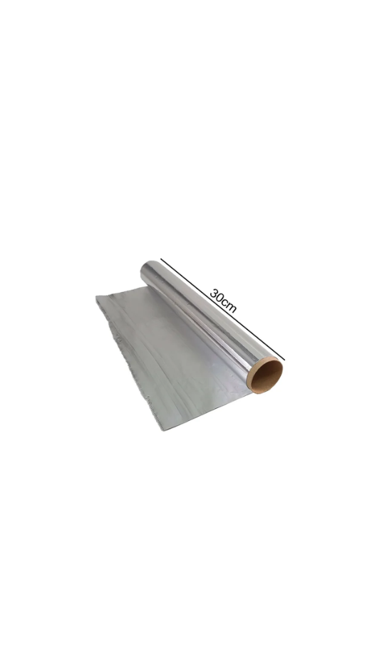 Papel alumínio resistente, ideal para conservação de alimentos, assados e proteção térmica. Mede 0,30 metros de largura por 7,5 metros de comprimento.