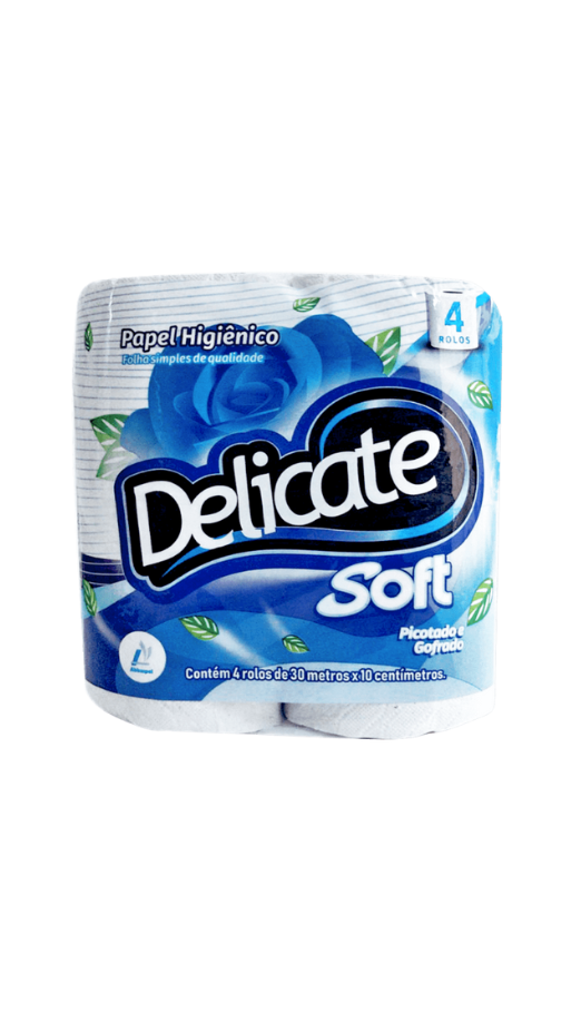 Papel higiênico Delicate em bobina com folha dupla, medindo 4 cm de largura por 30 metros de comprimento, acondicionado em embalagem com 16 unidades.