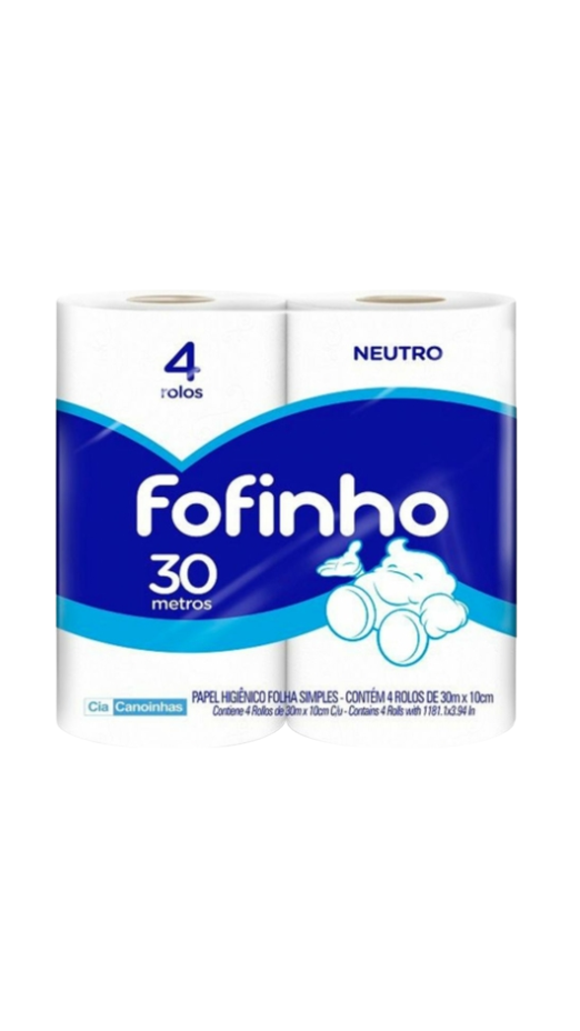 Papel higiênico Fofinho em bobina com folha dupla, tamanho 16 cm x 4 camadas x 30 metros.