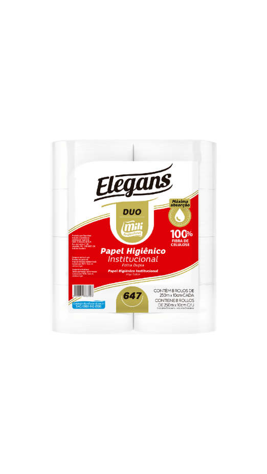 Papel higiênico de alta qualidade com folha dupla, apresentado em 8 rolos de 250 metros cada, fabricado com 100% matéria-prima Duo, garantindo maciez e resistência para uso corporativo.
