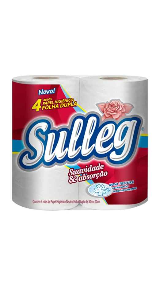 Papel higiênico Sulleg com folha dupla, pacote com 4 rolos de 20 metros cada.