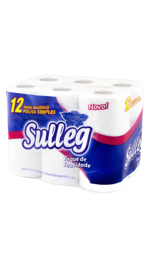 Papel higiênico Sulleg folha simples, pacote com 12 rolos de 30 metros cada.