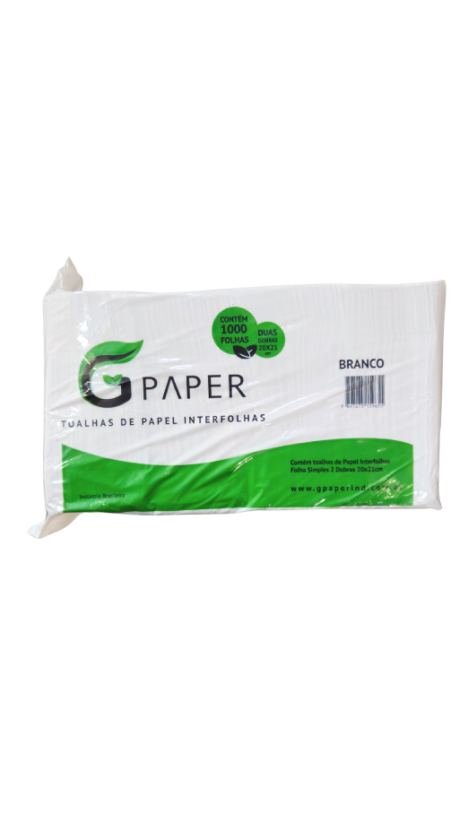Papel toalha interfolhado GPaper, folha simples, branco, com 1000 folhas de 20 x 21 cm. Ideal para uso profissional com bom custo-benefício.
