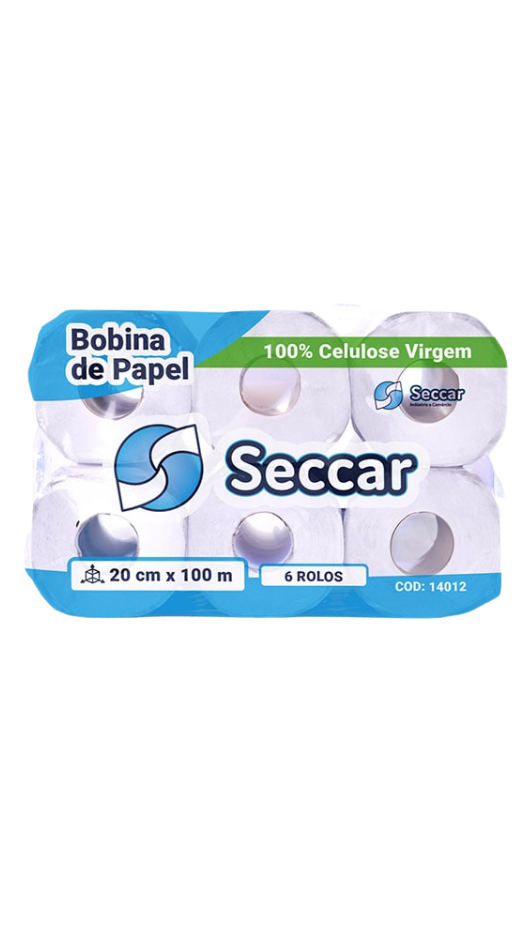 Papel toalha em bobina luxo da marca Seccar, com 6 rolos de 100 metros por 20 cm de largura. Produto de alta qualidade, ideal para ambientes que exigem sofisticação e eficiência na secagem.