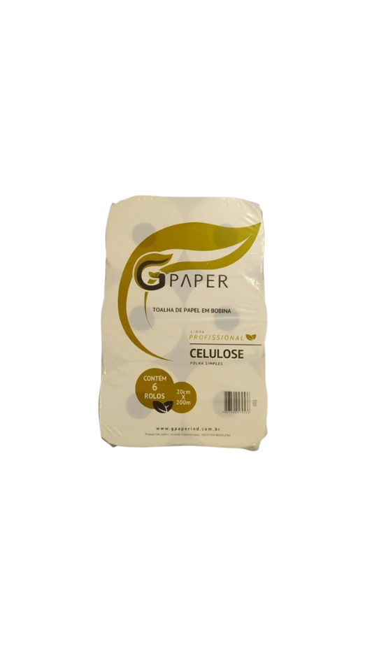 Papel toalha em bobina GPaper, 100% celulose, com alta gramatura (24/26g), ideal para ambientes com grande fluxo. Embalagem com 6 rolos de 200 metros cada.
