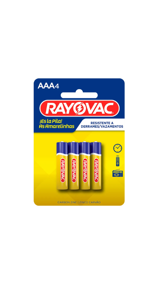 A Pilha Palito AAA Rayovac é perfeita para alimentar controles remotos, relógios, brinquedos, lanternas e outros dispositivos eletrônicos. Com alta confiabilidade e desempenho estável, oferece energia duradoura e segura para o dia a dia. A cartela com 4 unidades proporciona ótimo custo-benefício e praticidade na reposição.