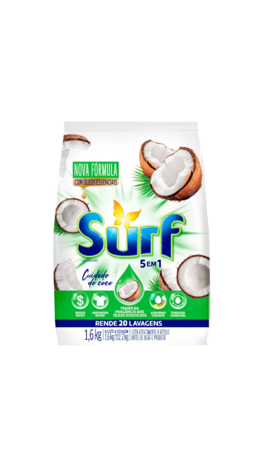 A fórmula de Surf Cuidado Coco é desenvolvida para penetrar profundamente nas fibras dos tecidos, removendo sujeiras e manchas com eficácia. Além do poder de limpeza, o diferencial deste sabão em pó é o seu cuidado com as roupas, que ajuda a preservar as cores e a maciez, e o aroma suave e tropical de coco, que deixa uma sensação agradável de frescor e bem-estar nas peças. A cor azul do sabão em pó também auxilia no realce do branco, mantendo o aspecto de novo. É adequado para uso em máquinas de lavar ou para lavagem manual, proporcionando praticidade e resultados impecáveis.