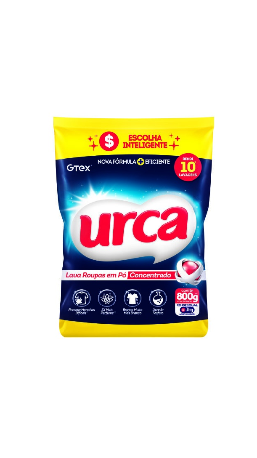 Sabão em pó azul Urca de 800g, um clássico com fórmula eficiente para a limpeza diária de roupas, garantindo brancos mais brancos e cores vibrantes.