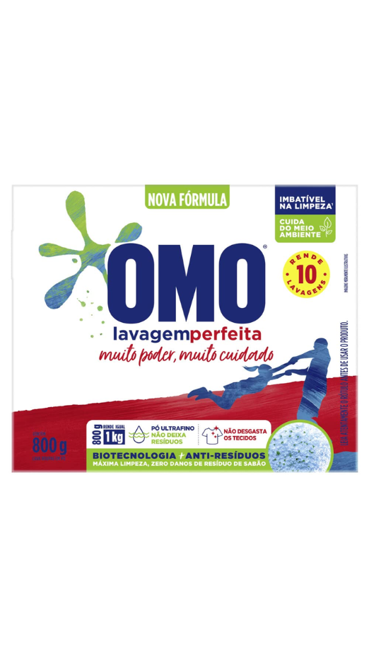 Sabão em pó OMO Lavagem Perfeita de 800g, ideal para limpeza profunda de roupas, removendo manchas e maus odores desde a primeira lavagem.