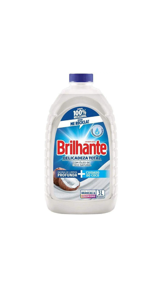 Sabão líquido Brilhante de 3 litros com óleo de coco natural e fragrância suave, ideal para uma limpeza profunda e delicada de roupas brancas e coloridas.