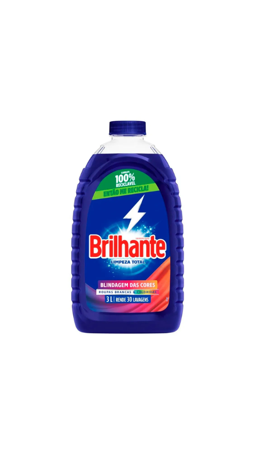 Sabão líquido Brilhante de 3 litros com alta performance, ideal para limpeza profunda e remoção de manchas de roupas brancas e coloridas, deixando-as limpas e perfumadas.