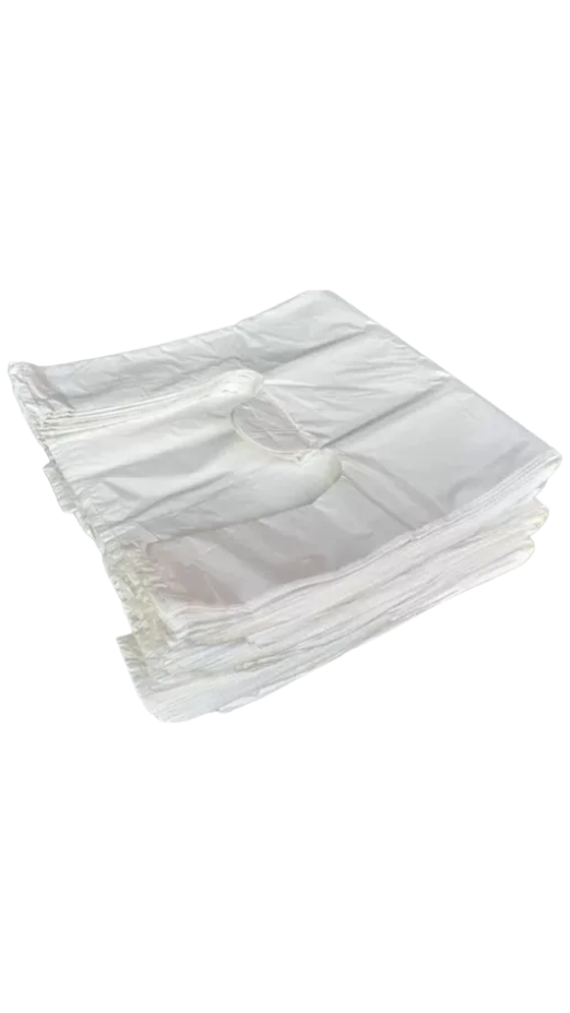 Pacote com 1000 sacolas plásticas tipo camiseta leitosas de 38x48cm, ideais para uso em diversos comércios, oferecendo praticidade, resistência e discrição.