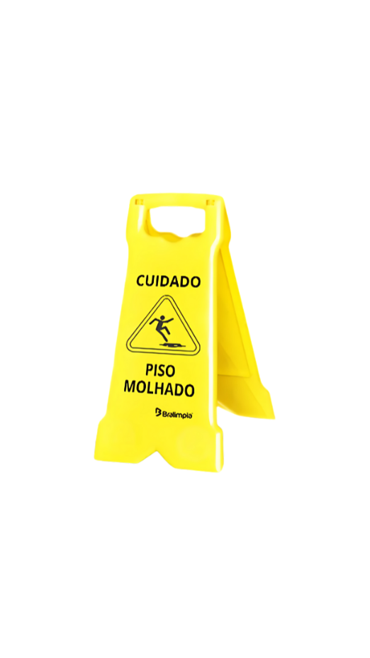 Fabricado em plástico resistente e durável (geralmente polipropileno), possui uma estrutura leve e estável. Sua principal característica é a mensagem de “Piso Molhado” ou “Cuidado, Piso Escorregadio” (ou pictogramas universais de escorregamento) impressa de forma clara e visível em ambos os lados, muitas vezes em cores vibrantes como amarelo, para atrair a atenção. O formato compacto permite que seja facilmente dobrado ou empilhado para armazenamento em pequenos espaços, sem comprometer a sua funcionalidade. É um investimento inteligente para garantir a segurança de clientes, funcionários e moradores, minimizando o risco de quedas e acidentes em locais temporariamente escorregadios.