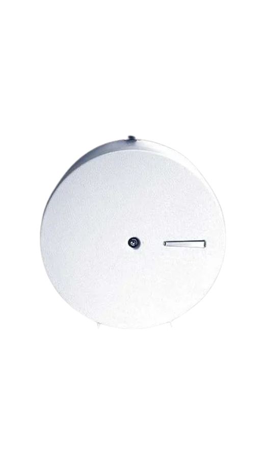 Dispenser metálico branco para papel higiênico rolão de até 800 metros, ideal para banheiros com alto fluxo.