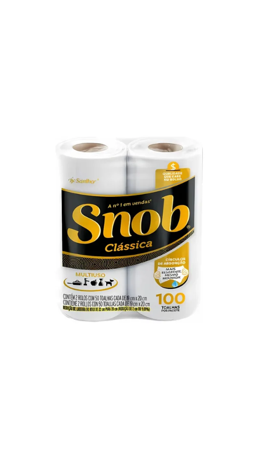 Pacote com 2 rolos/pacotes de toalha de papel Snob, cada um com 50 folhas, ideais para uso doméstico na cozinha e em diversas tarefas de limpeza, oferecendo absorção e praticidade.
