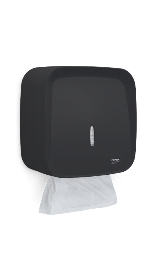 Toalheiro para papel toalha interfolhado, fabricado em ABS na cor escura (Dark), da linha Invoq, ideal para dispensar folhas uma a uma, promovendo economia e higiene com um toque de modernidade.