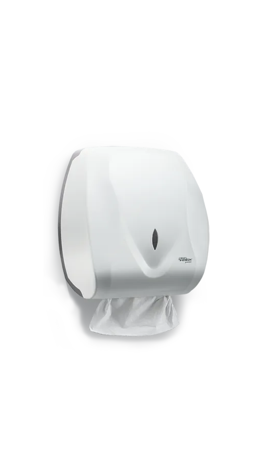 Toalheiro para papel toalha interfolhado, fabricado em ABS, da linha Premisse Velox, ideal para dispensar folhas uma a uma, promovendo economia e higiene em banheiros de alto fluxo.
