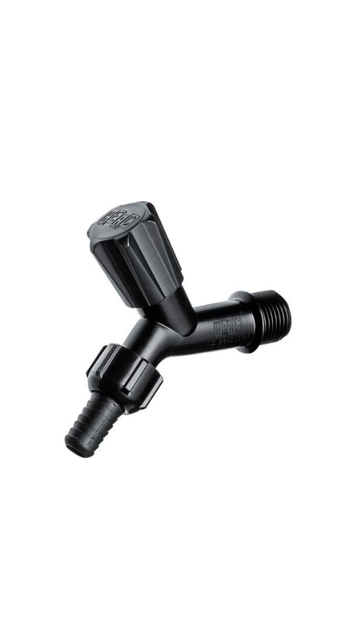 Torneira de jardim em plástico na cor preta, ideal para áreas externas, como jardins, quintais e lavanderias, oferecendo praticidade, resistência e um design discreto.